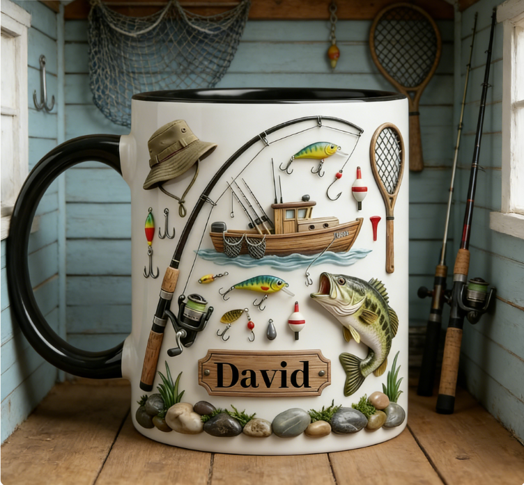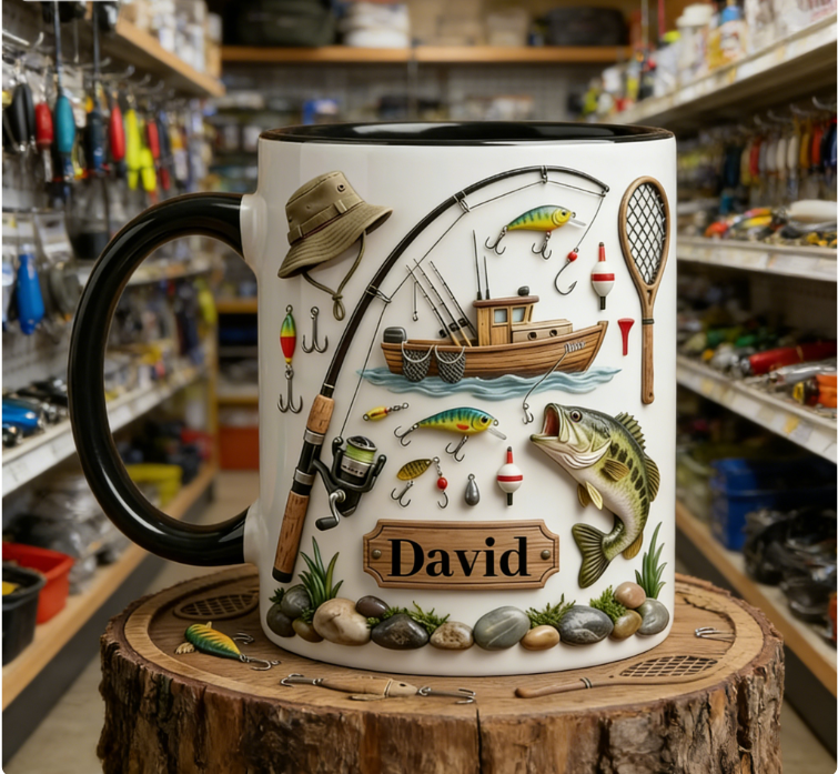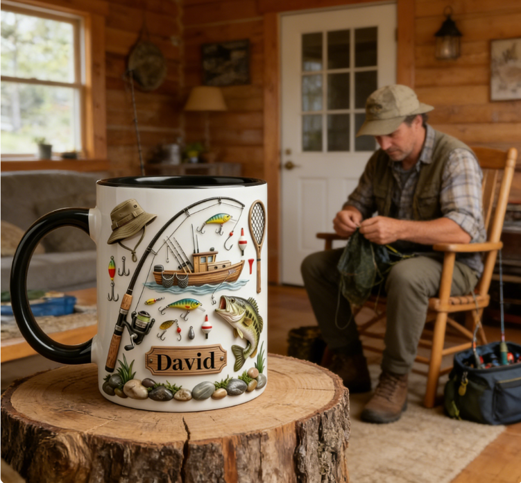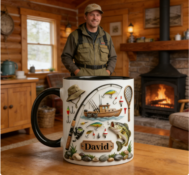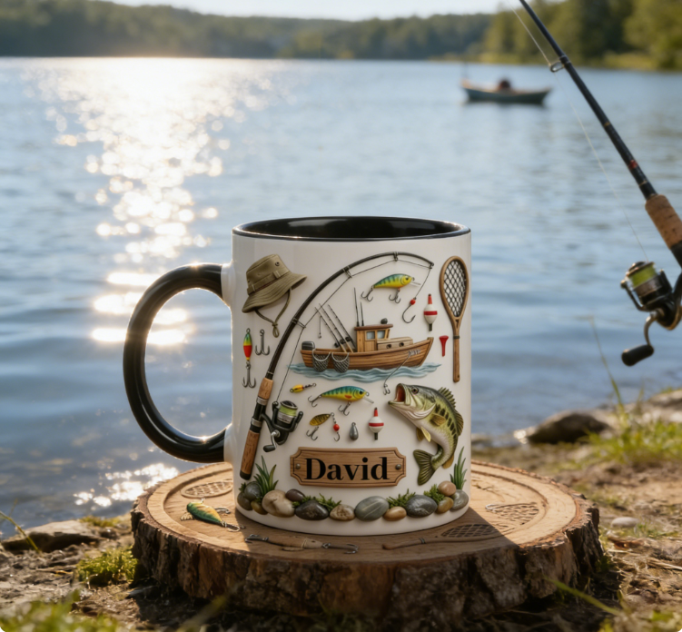 Custom Name Angling Scene Mug – Lakeside Fishing Coffee Cup for Outdoor Lovers