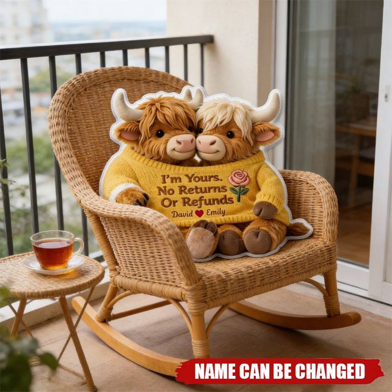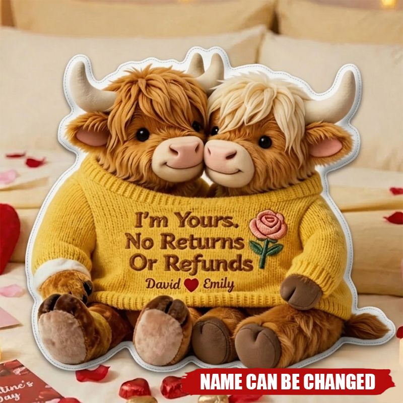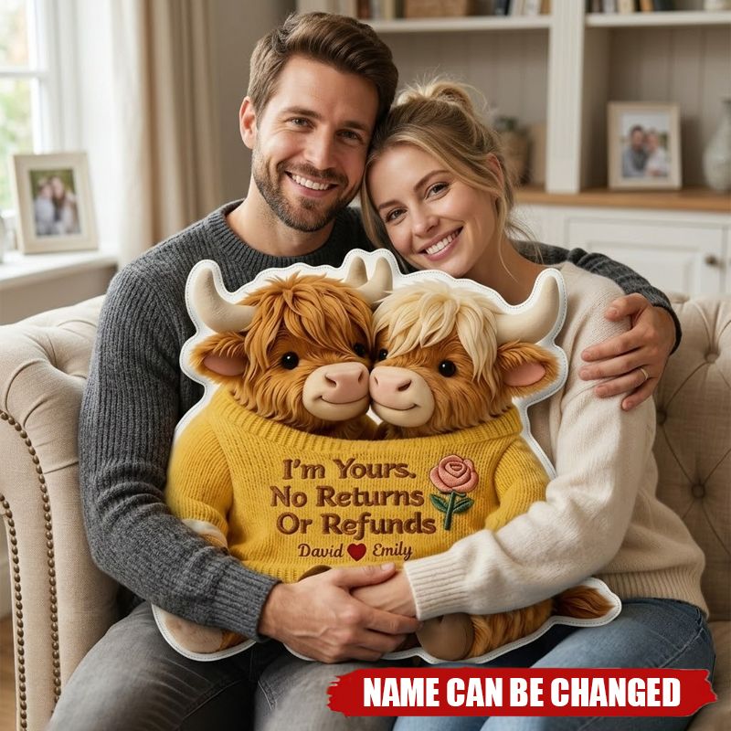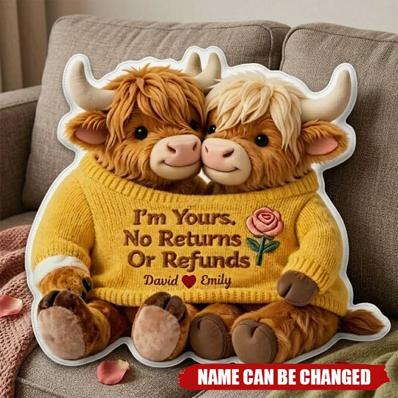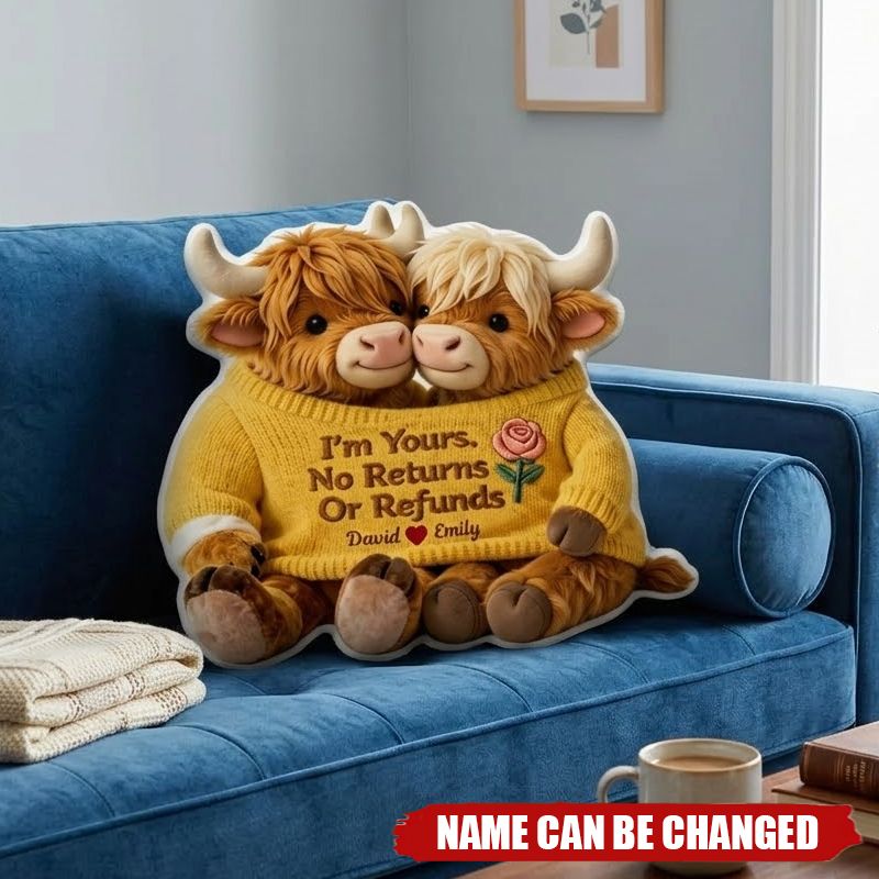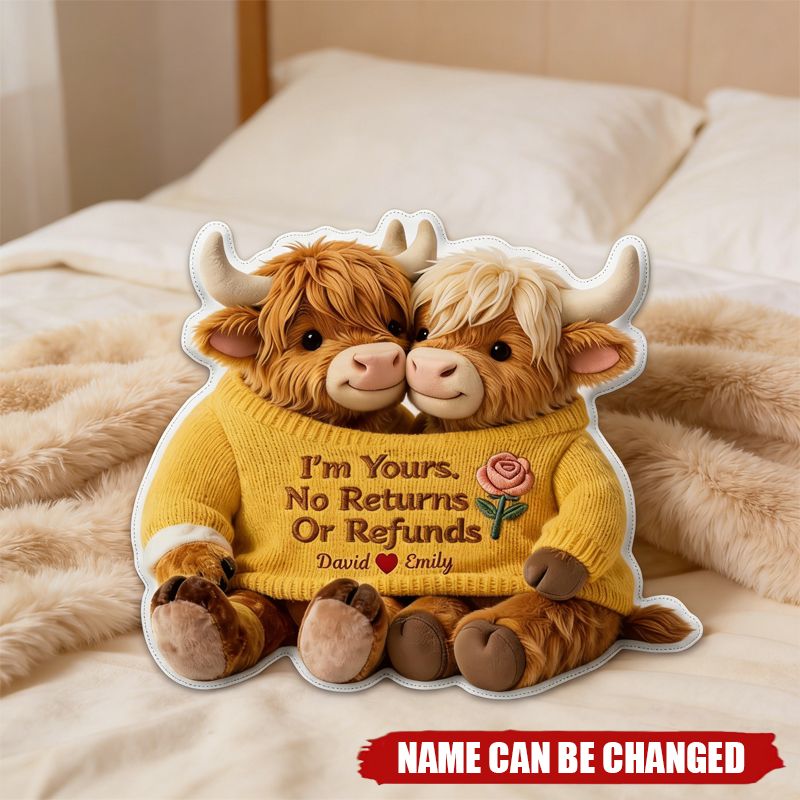 Personalised Highland Cow Couple Pillow – Custom Names, I'm Yours, No Returns or Refunds