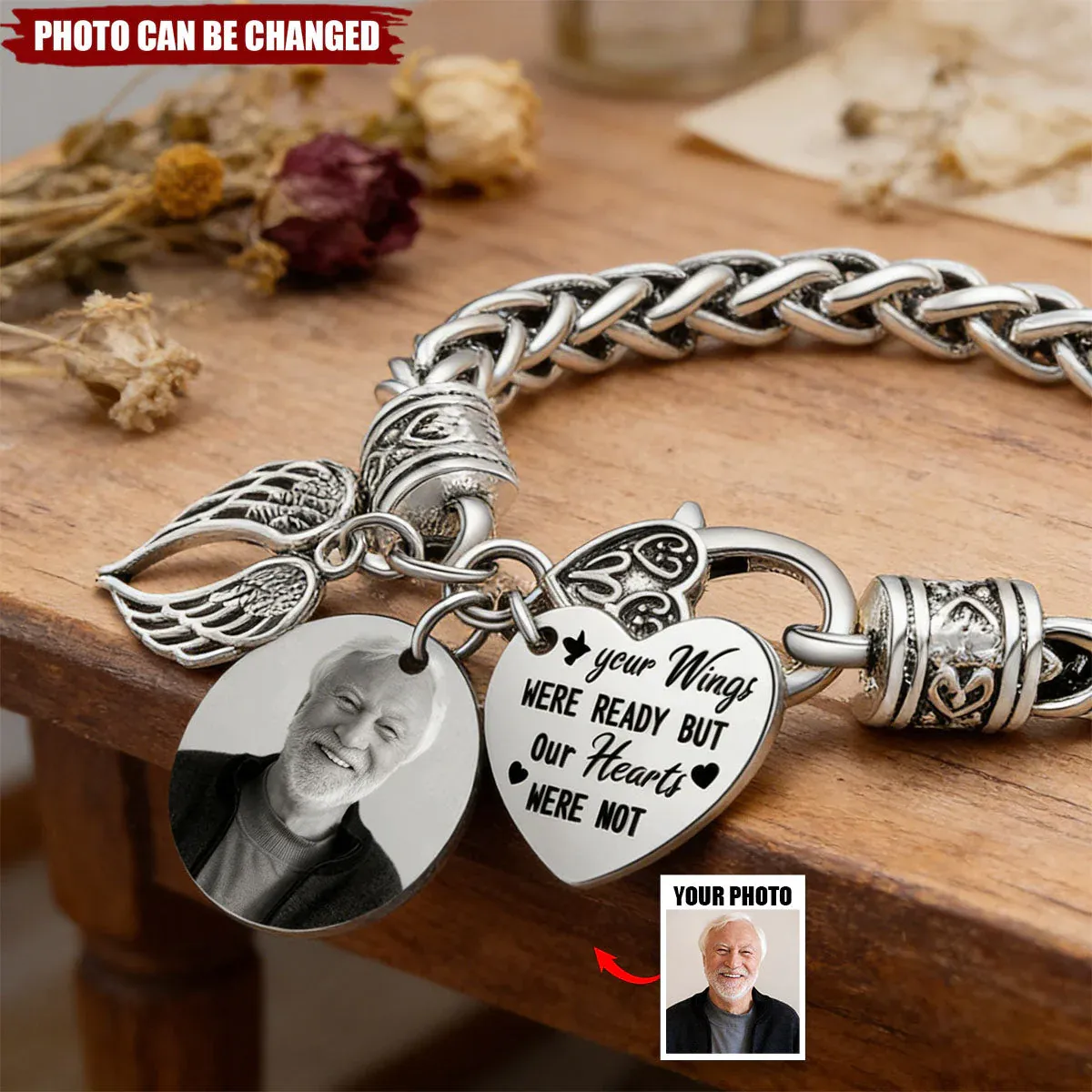 This bracelet is crafted with care and can be personalized with a photo and the name of the person or pet you wish to remember, making it a unique and heartfelt tribute. It's a perfect way to keep the memory of a loved one close to your heart, providing a sense of connection and comfort during times of grief.